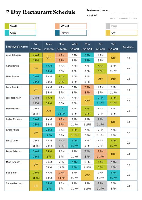 7 Day Restaurant Schedule Template. Free support & trainingsave time and money